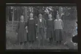 "Hushållsstugan, Floda" Ungdomar, fyra flickor och en pojke, poserar utomhus.