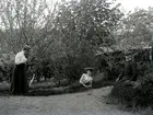 Enligt noteringar: "31 juli 1929. Brudparet Gösta Hugo Ramsten och Linnea, f. Moberg, (bägge musikdirektörer?) utanför förvaltarbostaden, Torreby. Äreporten inrymmer bokstäverna 'R' och 'M'. Det restes även upp ett tält där middagen intogs. Paret fick två barn, Göran och Märta. Den senare anställd på Svenskt Visarkiv." (BJ) Id.: Lars Ramsten, SVT Falun.