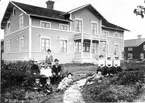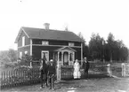 Per Larssons nybygge på Lenninge 6:32. Den synliga timmerstommen är en del av det från Smehammar flyttade huset. Personerna: längst ner Herman Larsson och en okänd kvinna. Pojken på trappan är Sixten Larsson. Stående från vänster: Anna Larsson, Hilda Styf, Linnéa Larsson och Per Larsson. Sittande troligen Herbert Olsson från Mjölnars. Foto 1918-1919.