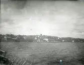 Enligt fotografens noteringar: "Gustafsberg." Plats: "från sjön." Datum: 12 Juli 1897 Tid: Kl 8.30 e.m. Ljus: Solsken Bländare: No 2 Objektiv: Svenska Express Exponering: Hastighet No: 3 Framkallning: Hydroechinon, Eikonogen Anmärkningar: "Taget på för långt håll, underexponeradt och hål i Kameran."