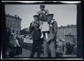 De tre bröderna Morthensen, Sven (mitten) Birger och Gunnar arm i arm på trappen till familjens villa Solveden. Alla bär studentmössor.