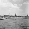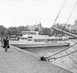 Fartyget anlöper Tjockö brygga på resa Norrtälje-Stockholm, 1950-06-17.