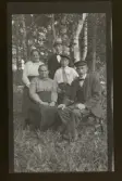 Grupporträtt av ett sällskap unga människor, taget utomhus. "Fogelstad."