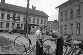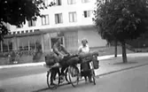 Två studentskor behängda med otaliga blombuketter vid Varbergs kyrka. I bakgrunden syns en mor med barn och barnvagn vid Televerkshuset.