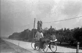 Två finklädda flickor, Iris t.v. och Mary t.h, i vida 1940-talsbyxor, hattar och broscher står arm i arm i en backe med lastbilar och en elcentral i bakgrunden (se även foto EA1183).