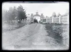 "Nischnij Tagil. Nunneklostrets ingång. Klostret är beläget ca 5 km utanför Tagil. Xenia sitter i vagnen vid muren"