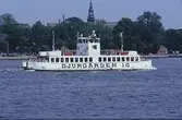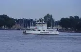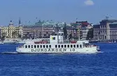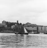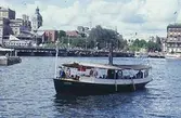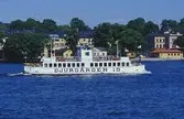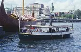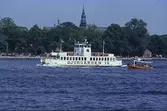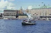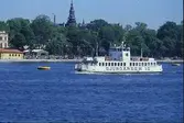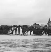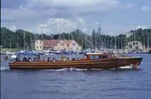 Motorbåtsflottilj på utgående i Stockholms ström. I bakgrunden Fåfängan.