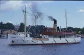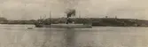 Foto i svartvitt visande lastångfartyget "FRANZ" av Kiel, på Stockholms ström, omkring 1900-talet.