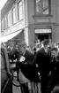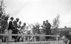 Fem patienter på Kustsanatoriet Apelviken har klätt ut sig med anspelning på romer och står innanför ett spjälstaket. Personen längst till vänster har bandage om ena foten. Hör samman med bildnr KSA112.