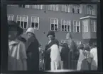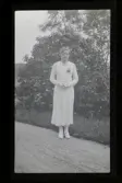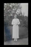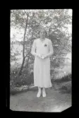 "Alma Gustavsson, Katrineholm /A-LE" Kvinnlig konfirmand porträtterad vid grinden till ett hus.