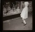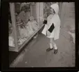 Människor framför ett marknadsstånd som säljer dockor och dockkläder. Skansen, Stockholm.
