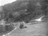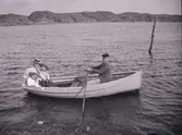 Semesterfirare vid Hällarna. Vid årorna sitter Gustav Danielsson. I solstolen ligger hustrun Signe.