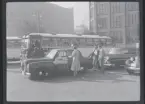 Stockholm, Konserthuset och Hötorget. Spårvagn, hästdragna kärror och bilar på Kungsgatan.