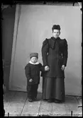 Porträtt av sittande kvinna med pojke. Kvinnan med mittbenat uppsatt hår, vit spetsmössa, rutig klänning med vita manschetter och svart sjal. Pojken i femårsåldern, stående till höger, klädd i mörkt färgad dräkt, jacka och byxor, samt vit krage. Dagerrotyp / daguerreotyp daterad 10 november 1848. Förgylld, något profilerad, träram. Nordiska museet inv.nr 176707. - Portrait of a woman and a boy dated 10 November, 1848. Sixth-plate daguerreotype.