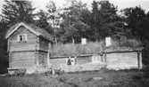 Gårdsmiljö från kv Hjorten 9 i Gränna. Foto mot torget, via portlider, där det är torghandel. Till höger skymtar höga staplar med långa vedträn.