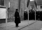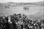 Besökare står på en berghäll för att se ett transportflygplan i luften under invigningen av Bromma flygplats den 23 maj 1936. Text vid foto: "Invigningen av Bromma"