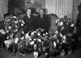 En äldre kvinna i ett hem, omgiven av blommor, 1930-tal. Antagligen firar hon sin födelsdag.