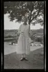 "Alma Gustavsson, Katrineholm /A-LE" Kvinnlig konfirmand porträtterad vid grinden till ett hus.