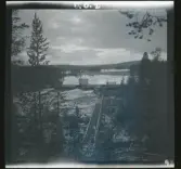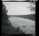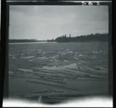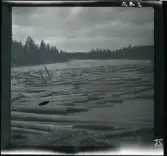 Anteckning påsiktskopia: ”Norrbotten, Överkalix sn. Övre Lansjärvs by. Vestervik no 2. Foto fr. s.v. invid gårdstomten. Skrövälvens utlopp i Öv. lansjärvsjön. Vårhögvatten, timmer."