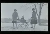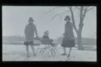 "Från As gård." Två kvinnor är ute på promenad i snön med ett litet barn i barnvagn.
