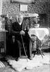 Kajsa i Dyhålet. Mormor till Konrad Gustavsson, Stenåsen. På armen har hon, som alltid när hon var ute, sin "stickekorg" innehållande en stickstrumpa. Hon stickade medan hon gick. Stina Kajsa Andreasson, född 3/8 1834, död 19/7 1924. Gift med Gustaf Johansson, f 1834. Fyra döttrar. Hon var inte ensam om att bära spånkorgen med sticket i på sina promenader. Många gummor gjorde sammaledes för att utnyttja den tid som annars skulle "gått bort", så fort man måste förflytta sig någonstans. Reprofotograf: Gunnar Berggren.