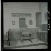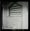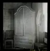 Fotografens anteckning: 33. Etnografica enl. Dahlbäcks Lansjärvs-katalog, foto 1930. Se från h. till v. på bilden: Nr 94 t, fragment av utdragssäng. Utskurna lister bl.a. antika flätbandet. Blek röd bottenfärg, buskmålad. Listerna i grönt, gult, mörkblått. Målningsåret 1851. Nr 502 hörnskåp i 2 delar. Rosa målat. Nr 517 stol, h 75,5 cm. Se bild nr 40. Utdragssäng, se bild nr 20, 22."