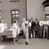 Gymnastiklärare Ebba Carlqvist med elever på Läroverkets skolgård.
