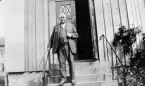 Hålahults sanatorium, exteriör, litet stenhus, kvinna, man, barn på trappa, mannen bär uniform.