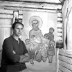 Ryss målar 18 april 1966 En rysk man med långt silvervitt hår och skägg. I bakgrunden syns en vägg fylld med målningar som han har gjort. Han är klädd i mörk tröja. or. Han går nedför en kort trappa utomhus.