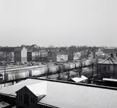 Ostmässan i Idrottshallen 19-20 november 1966. Landshövding Fallenius tackar lokförare Ivar Pettersson för en fin resa. Till vänster Eva Åsbrink.