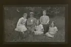 "Gerda och Emil Larsson, Frida, Lisa, Märta" Ett sällskap sitter ute i gräset på en äng.