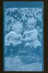 "Folke och Holger Bergstedt, Strömkärr f. 1916, Fogelstad" Två små barn sitter ute i en trädgård.