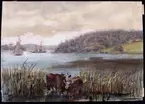 "Montebello. Tenöviken". Kor i vattenbrynet, båtar i bakgrunden. Akvarell av Fritz von Dardel.