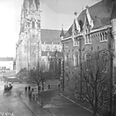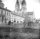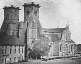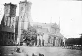 Arbetare står på byggnadsställning omkring Domkyrkans ena torn i samband medrestaureringen 1886-1894.