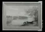 Foto av akvarell föreställandes ett sällskap sittandes ute i naturen.