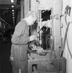 Oscaria Skofabrik, interiör, skotillverkning, fem arbetare. Bilden tagen för broschyr.