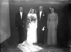 Enligt fotografens journal nr 7 1944-1950: "Adielsson, Bruden o systrarna Här". Enligt fotografens notering: "Brudparet Johansson - Adielsson. Bruden med systrar o Fr. Nilsen, Solgården".