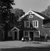 Huvudbyggnaden på Morlanda Säteri. I förgrunden amfora på pelare huggna i charnockit