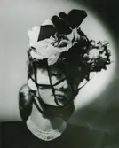 "Monsieur Erik". Modell i hatt med riklig dekor av textila blommor och band. Govt flor för ansiktet.