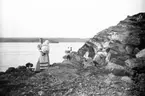 Foto av Ingrid Welander (f. Lagerholm) och en vän vid Högklint, Gotland. Bildtext i album: "Grodungar !".