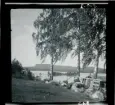 Tre män drar en eka över vattnet vid fjällgården i Kummavuopio, sommaren 1943.