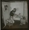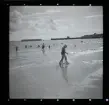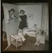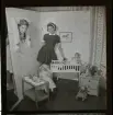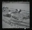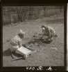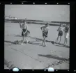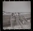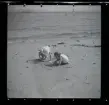 Två skrattande flickor drar ett litet barn, som sitter i en låda vilken fungerar som en pulka, längs en landsväg.