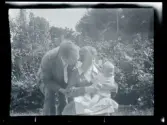En trädgård, möjligen till Hamnvägen 3. På gräsmattan står en korgstol där det sitter ett spädbarn. En flicka med rosett i håret och rutig klänning står till vänster och balanserar barnet. Till höger står en yngre flicka i mörk klänning och rosett även hon och tittar på.