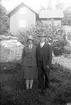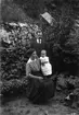 En kvinna sitter på ett räcke och bredvid henne står en man, kvinnan håller sin egna hatt i handen och har mannens hatt på huvudet