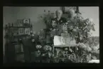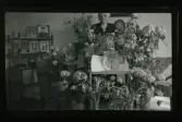 "Anna Åstrand, Märta Lötman, Robertsberg, Äs." Två kvinnor står vid ett bord fullt av gratulations-blommor.
