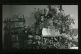 "Anna Åstrand, Robertsberg." En kvinna står i ett rum, omgiven av gratulations-blommor.