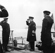 Riksmarskalken och några högre chefer på marinen i samtal under sjösättningen av Västervik.