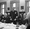 Bilden visar svenska sjöofficerare och chefer från Karlskronavarvet under middagen efter sjösättningen av HMS Halmstad.