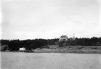 Badhytter, båtar, tandläkare Sandbergs hus. Gamla lilla lotsbåten vid bryggan närmast.