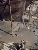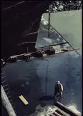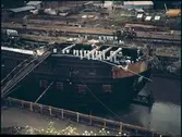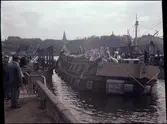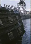 Vasa på väg in i GV-dockan på Beckholmen. Med ryggen åt kameran på vänster sida är kommendör Edward Clason, bredvid honom står arkeolog Per Lundström. Mannen med den "underliga" utstyrseln till höger i bild är en av dykarna. Dykarna var klädda så under sina tungdykardräkter.